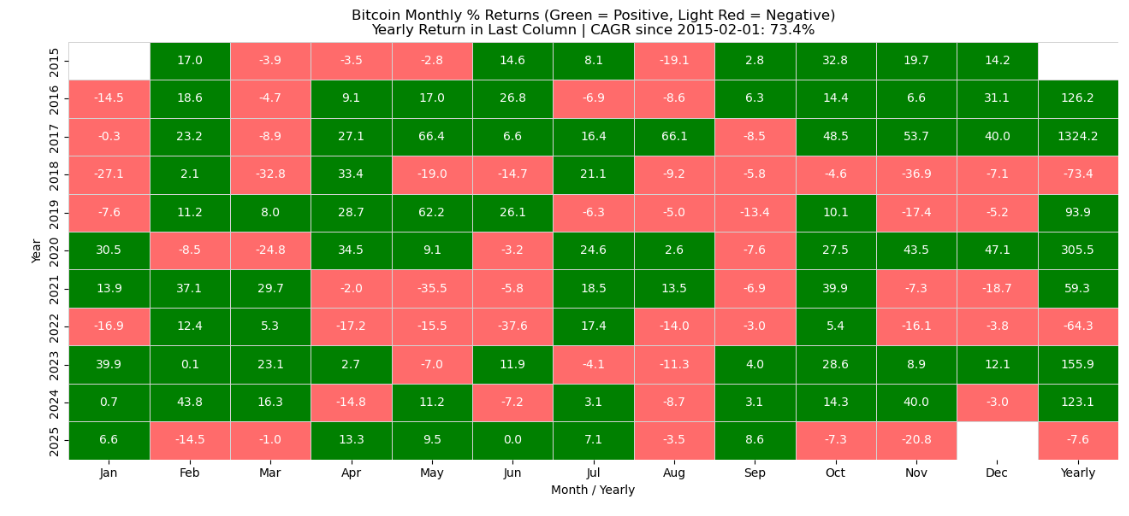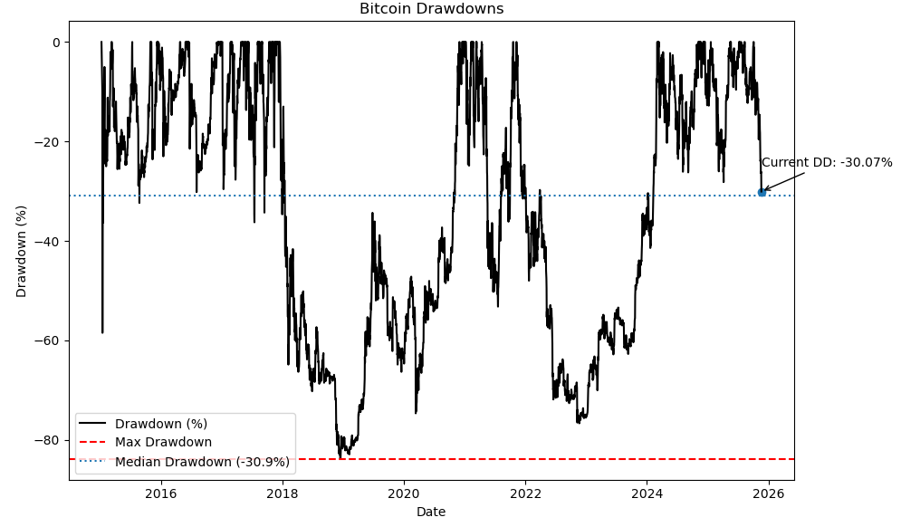 Since 2015, using daily closing prices from FRED’s CBBTCUSD series, Bitcoin has spent 3,770 out of 3,964 days in drawdown—about 95% of the time it has been below an all-time high. The median drawdown over this period is a whopping −31%.
