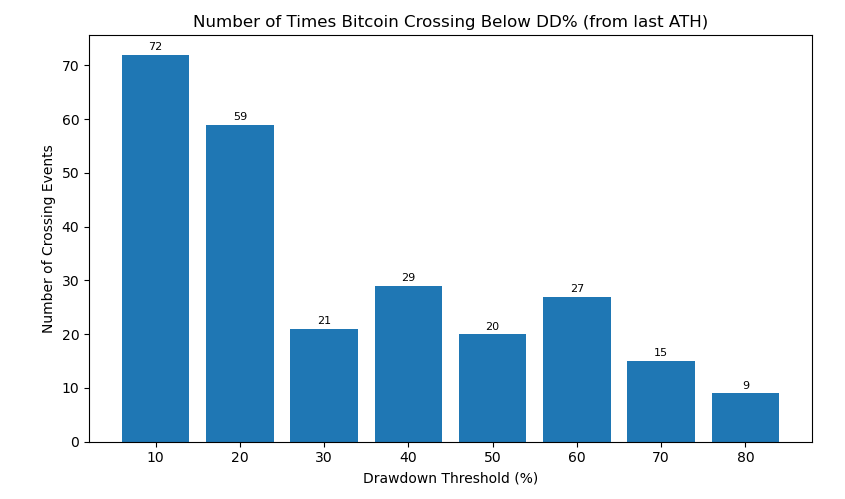 Remember, these are threshold crossings, not just days spent at that level. An 80% drawdown doesn’t show up once in the chart—it reflects the moments when the market first falls through −80% from a prior high during a given move. In a choppy bear market, Bitcoin can slice through a level, bounce back above it, and then break through again, adding multiple threshold-crossing events over time.