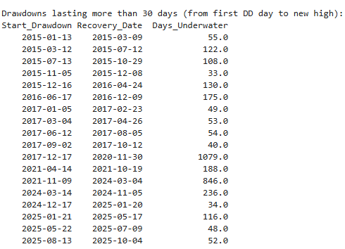 Below are all the days, and how long Bitcoin has been in a drawdown, for episodes lasting more than 30 days.